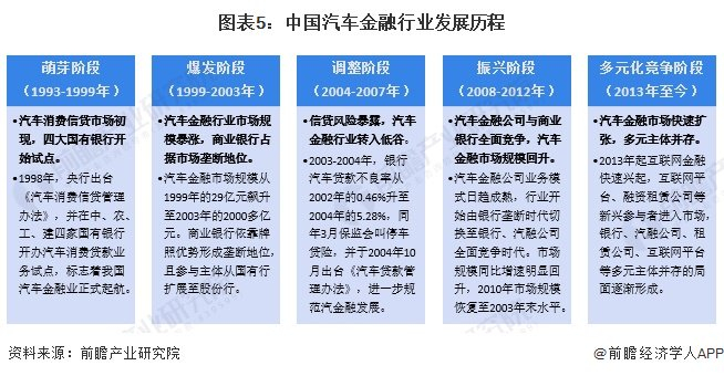 我国汽车消费金融业萌芽于20世纪90年代,随着国内私人汽车消费的升温,汽车金融行业进入快速增长阶段,市场规模暴涨;2004年信贷风险逐渐暴露,银行汽车贷款不良率大幅提高,随着车贷险被紧急叫停,汽车金融行业也转入低谷;2008年起汽车金融市场规模回升,汽车金融公司接连入场,开始与商业银行全面竞争;2013年起,随着互联网金融的兴起,更多新兴参与者进入市场,汽车金融行业进入多元化竞争阶段;在我国扩大内需、刺激消费大背景下,汽车金融领域的利好政策不断出台,这一阶段市场规模同比增速稳定于20%-30%,行业在多元格局渐成、政策支持加大的驱动下保持快速增长。