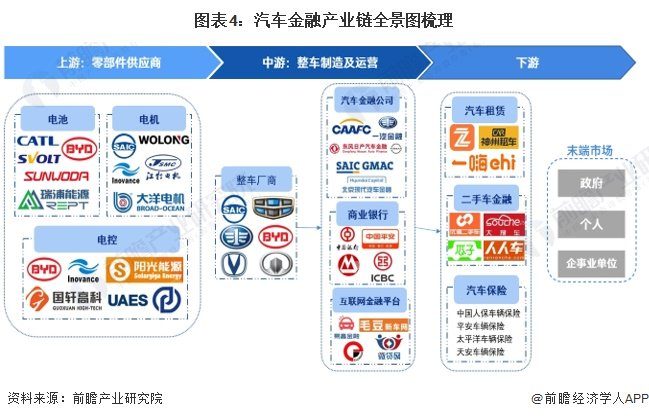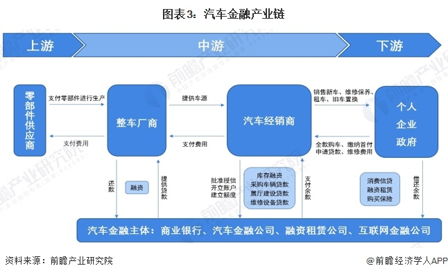 汽车金融产业链上游主要是零部件供应商,负责为整车厂商提供汽车零部件以进行生产;中游主要包括整车厂商和汽车经销商,负责整车制造及车源提供,并为用户提供贷款、融资租赁等多种购车方案;下游通过线上线下等渠道将汽车销售给终端个人和企业汽车消费者,并涵盖售后服务、汽车保险、汽车租赁等金融服务;商业银行、汽车金融公司、融资租赁公司等汽车金融主体则参与汽车金融产业链中下游。