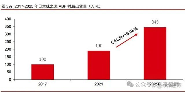 导致 ABF 载板供不应求的主要原因有以下四点: 1)关键原材料被垄断且扩产节奏慢。ABF 载板上游的关键原材料为 ABF 树脂,目前 主要由日本味之素垄断,垄断局面预计短期内不会改善。据天和防务公司公告,预计味之 素 2021-2025 年 ABF 树脂出货量的复合增速约为 16.08%,低于 ABF 载板需求量增速 16.86%。