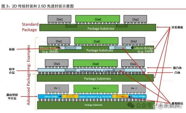 Bumping、RDL、Wafer 和 TSV 是先进封装的四要素,具备其中一种即为先进封装。 1)Bumping(凸块)技术,普遍应用于 FC 封装中,通过焊球起到晶圆之间、晶圆与封装 基板之间电气互联和应力缓冲的作用,随着 Bumping 技术的发展,金属凸点越来越小,逐 步发展为混合键合(Hybrid Bonding)技术,该技术制造的电介质表面较光滑、无凸点, 且集成密度更高;2)重布线层(Re-Distribution Layer,RDL)技术,起到 XY 平面上电 气互联和延伸的作用,广泛应用于 WLP 和 2.5D/3D 封装中,不适用于 FC 封装;3)晶圆 (Wafer)技术,起到芯片基底和 WLP 封装载体的作用,也可与硅基板共同实现 2.5D 集 成,随着 Wafer 技术的发展,Wafer 面积逐渐增大;4)硅通孔(Through Silicon Via,TSV) 技术,起到 Z 轴方向电气互联的作用,在实现多维立体结构封装中极为重要。