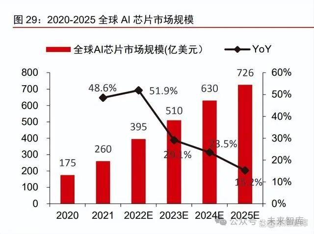 AI 服务器、高算力 AI 芯片需求高增,推动 ABF 载板需求快速增长。上文提到, TrendForce 统计,在 AI+应用广泛落地的刺激下,AI 服务器 2022 年出货量为 85.5 万台, 且预计 2022-2026 年 AI 服务器的年化复合增长率将达 22%,2026 年出货量将达 236.9 万台。IDC 统计,2022 年全球 AI 服务器市场规模为 183 亿美元,IDC 预计 2026 年全球 AI 服务器市场规模将达到 347 亿美元,对应 CAGR 为 17.35%。AI 芯片方面,人工智能 商业化应用落地推动 AI 芯片市场高速增长,华经产业研究院预计,2025 年全球 AI 芯片市 场规模将达到 726 亿美元,对应 2020-2025 年 CAGR 为 29.27%;2023 年,AI 服务器+ 交换机和 AI 芯片在 ABF 载板终端需求应用领域所占比例分别达到 25%和 10%,合计占比 35%,是 ABF 载板需求快速增长的关键驱动力。