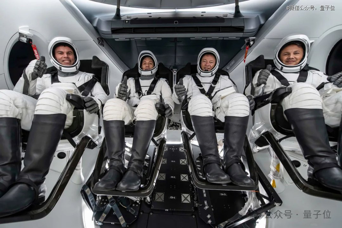 一共有4名宇航员在列,他们乘坐SpaceX的龙飞船,由猎鹰9号火箭推送至太空。