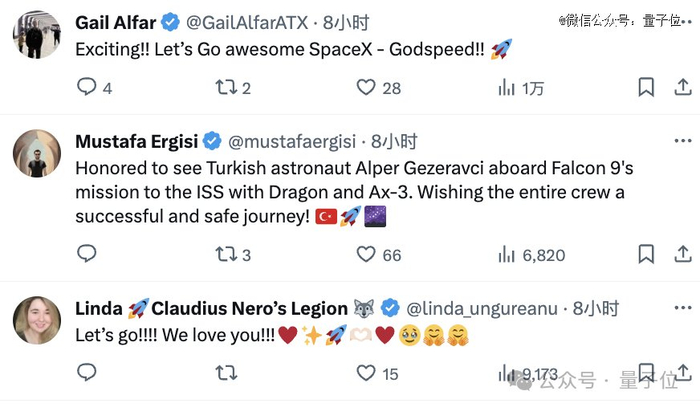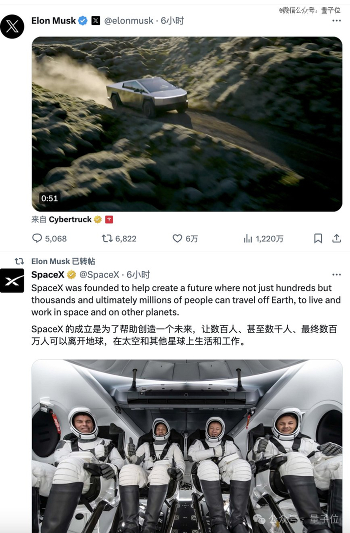 最后,对于本次成功发射,马斯克显然“淡定”了一些,没有发表什么特别的祝词,只是连续转了好几条相关推特。
