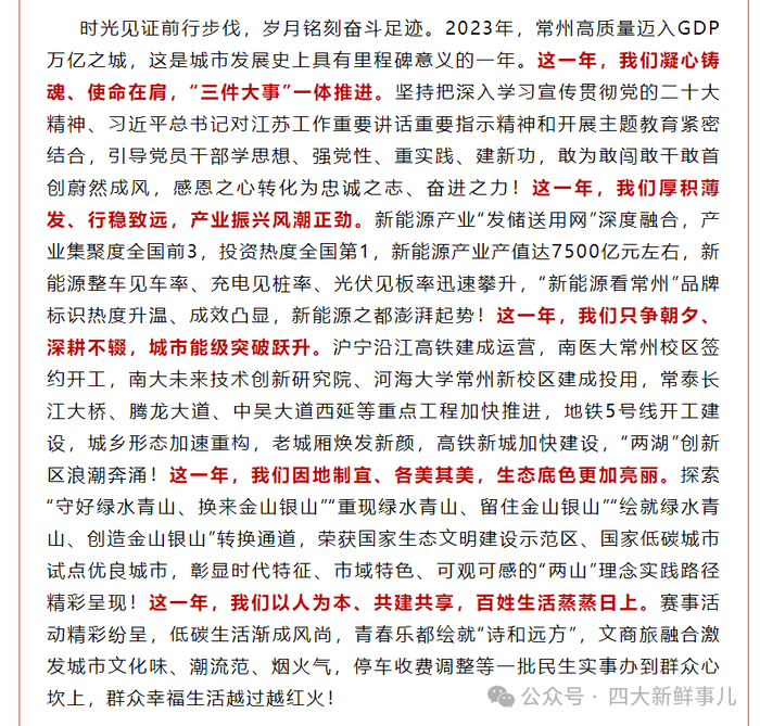 据介绍,仅新能源产业,2023年,常州“发储送用网”深度融合,产业集聚度全国前3,投资热度全国第1,新能源产业产值达7500亿元左右,新能源整车见车率、充电见桩率、光伏见板率迅速攀升,“新能源看常州”品牌标识热度升温、成效凸显,新能源之都澎湃起势。