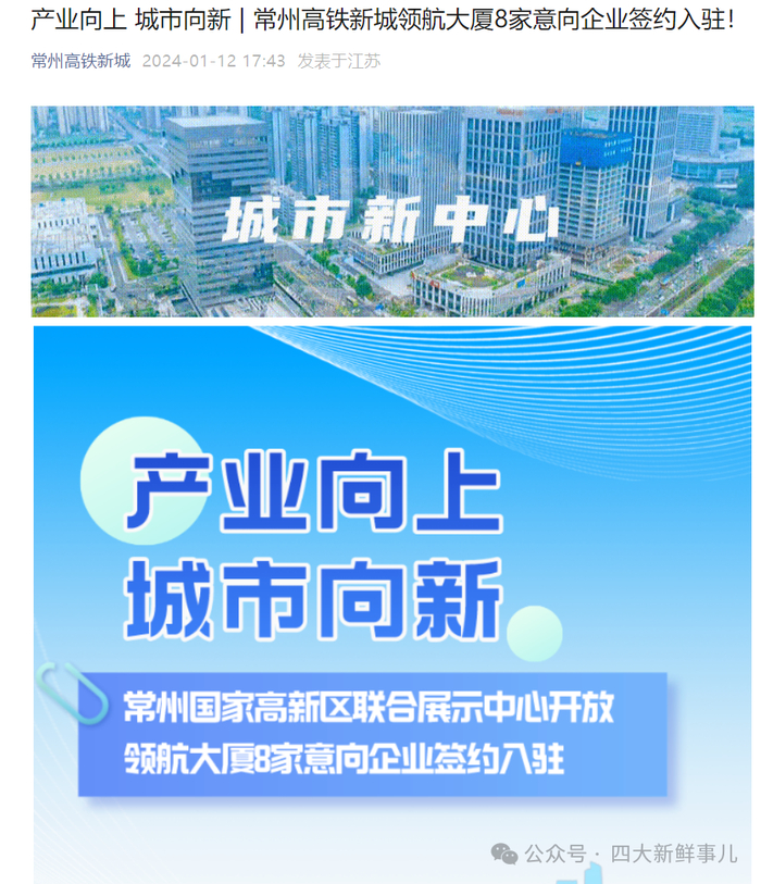 据常州高铁新城2024年1月12日消息,常州国家高新区联合展示中心开放暨领航大厦入驻企业签约仪式在常州高新区创新展示中心举行。