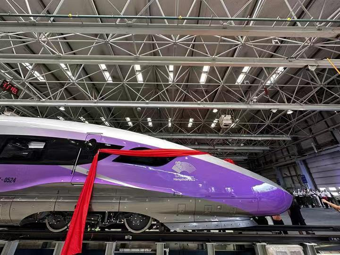 这是2023年7月21日拍摄的复兴号亚运智能动车组外观。当日,复兴号亚运智能动车组在位于吉林长春的中车长春轨道客车股份有限公司正式下线。新华社记者 马晓成 摄