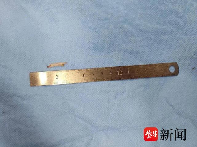 一直等待在手术台边的心胸外科副主任医师施益军也适时给出了细化方案:局部做出小切口。在探查深度约5mm后,终于找到了鱼刺的踪迹,一块长约2.4厘米,宽约4毫米的刀片状鱼刺现出“真身”!