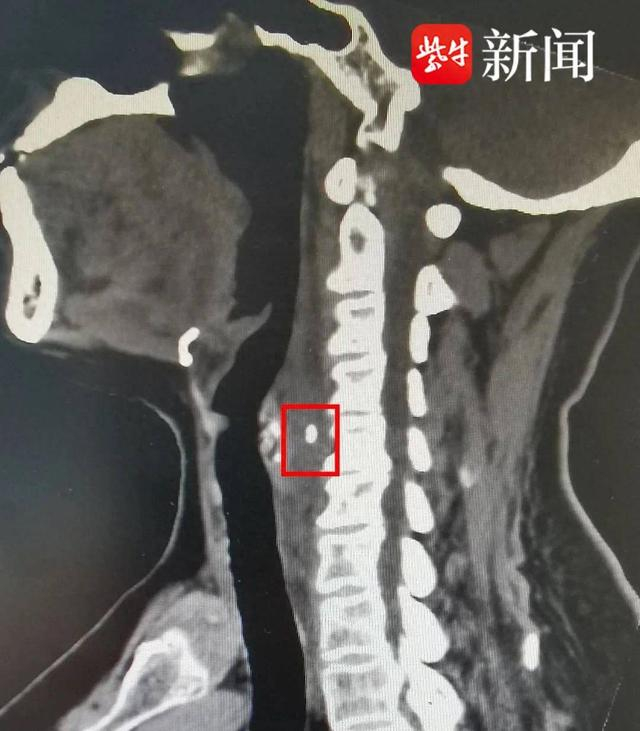 原来鱼刺并没有消失,而是进入到喉咙深部若隐若现,只有1/3不到卡在食道壁上,另外的绝大部分都在食管外。