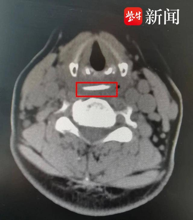 入院后,CT平扫下,其右侧口咽部舌根旁提示出现了小条状的高密度阴影。