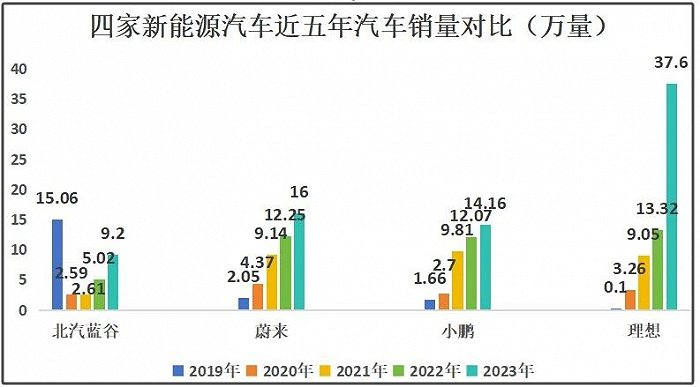 2021年,北汽蓝谷则完全被“蔚小理”超越,销量最高的小鹏汽车已是北汽蓝谷的3.76倍,而这种差距到了2023年依然存在,即使北汽蓝谷销量增长至9.2万辆,销量最高的理想汽车依然是北汽蓝谷的4.08倍。