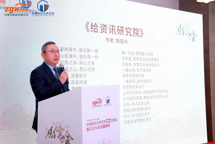 万众期待中,下午2点30分鸿儒会正式拉开序幕。会议一开始,陈雷鸣院长感怀于此情此景,吟诗一首表示庆贺,标题是《给资讯研究院》: