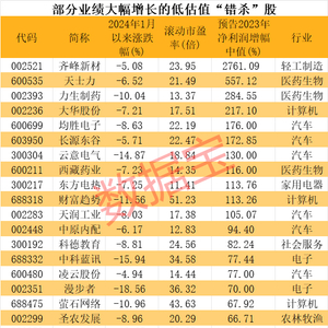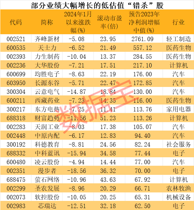 上述48股,净利润增幅最高的是轻工制造行业的齐峰新材,2023年净利润增幅上限超过29倍,扭转2022年业绩下滑的局面,2024年1月份以来股价跌幅超过5%;公司当前市盈率24倍左右,所属行业市盈率超过27倍。