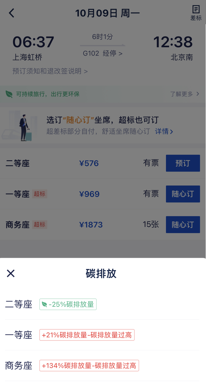 图:携程商旅的订票页面。“因为行驶同样距离,二等座车拉的人更多,摊到每个人头上的碳排放少,”携程曾向虎嗅解释了其中浅显的道理。