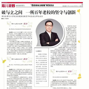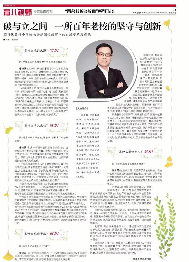 近日,《家庭教育周刊》的百名校长谈教育系列访谈整版专访闵行区曹行小学校长徐建国。靠什么吸引生源?靠什么焕发生机?靠什么改变学生?靠什么坚守初心?破与立之间,一起来看,这所百年老校是如何坚守和创新的。