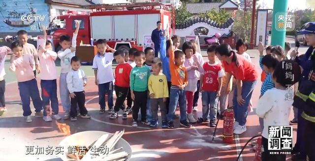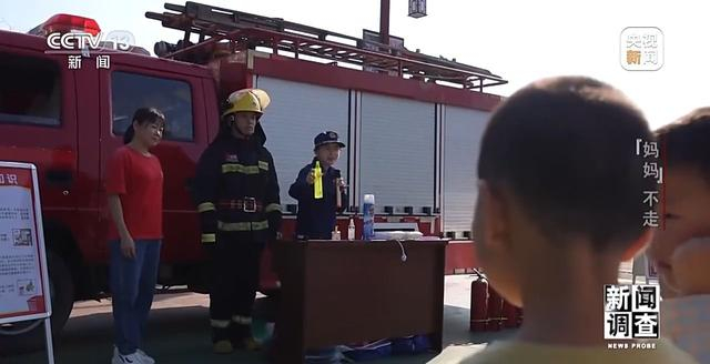 这是曾小芳请来消防员在为孩子们讲解消防知识,现场教会大家如何使用灭火工具。