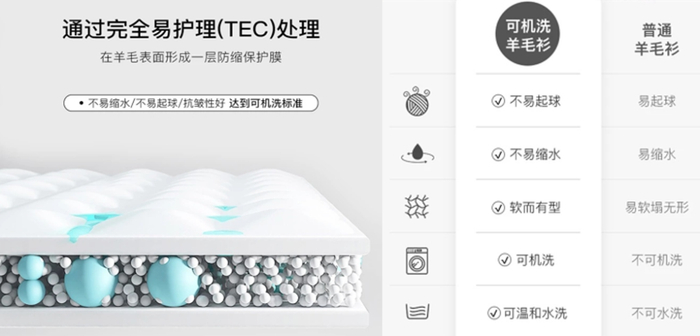 普通的羊毛衫经过洗衣机浸泡洗涤,毛鳞片吸水膨胀缠绕得更加紧密,出现“毡化”现象,普通羊毛衫只会越洗越硬、缩水严重。