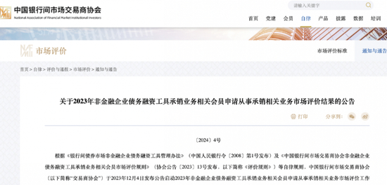 根据《银行间债券市场非金融企业债务融资工具管理办法》及《中国银行间市场交易商协会非金融企业债务融资工具承销业务相关会员市场评价规则》等自律规则,中国交易商协会于2023年12月4日发布公告启动2023年非金融企业债务融资工具承销业务相关会员申请从事承销相关业务市场评价工作(下称“首次评价”)。