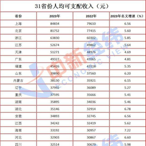 2023年31省份人均收入榜出炉。国家统计局19日公布的2023年居民人均可支配收入数据显示,上海、北京、浙江稳居前三,上海和北京更是携手首超8万元;西藏名义增速最高。你家乡排第几?