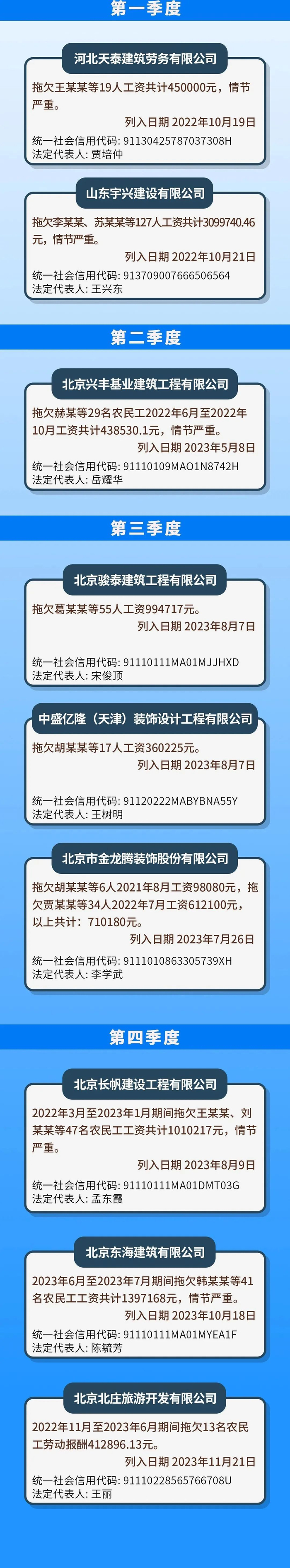 2023年,北京市人力资源和社会保障局公布了四批拖欠农民工工资失信联合惩戒对象名单,共有9家企业被列入黑名单。这些用人单位无故拖欠农民工工资,数额较大,而且经人力资源社会保障行政部门责令改正却拒不改正,严重侵害了农民工合法权益。