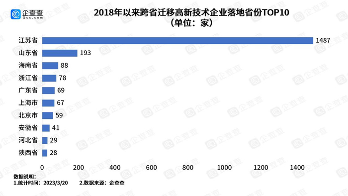 2021年,江苏制造业增加值达到4.16万亿,二十多年来首次超越广东,位列全国第一。2022年,江苏工业增加值反超广东,成为全国第一。企查查发布的《中国“抢企大战”城市地域全景报告》显示,2018年以来企业净流入量方面,江苏以3728家企业稳居第一,广东累计净流出7031家企业,成为全国迁移企业净流出量最大省份;2018年以来,我国合计有4439家高新技术企业迁址,其中跨省迁移的2324家,超六成落地江苏,其次193家落地山东,落地浙江的78家。