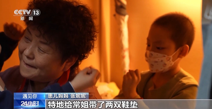 患儿妈妈 张妮妮:陆陆续续在这儿住了快一年多了。我娃一给他外婆打电话就说,我去了在心羽家园住着,还有常妈妈。我妈就说这次来了,特地给常姐带了两双鞋垫。每一次都回来看看常姐,这儿就像一个大家庭,比家还温暖。