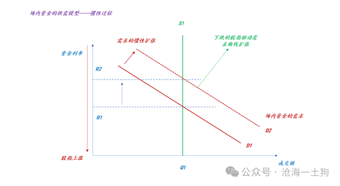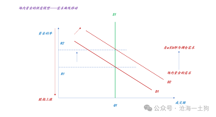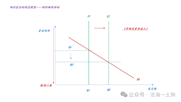 如上图所示,最符合我们日常直觉的场景是移动场内资金供给曲线的场景,即从S1扩张到S2,对应的场内资金的利率从R1下降至R2,成交额也从Q1扩大到Q2。