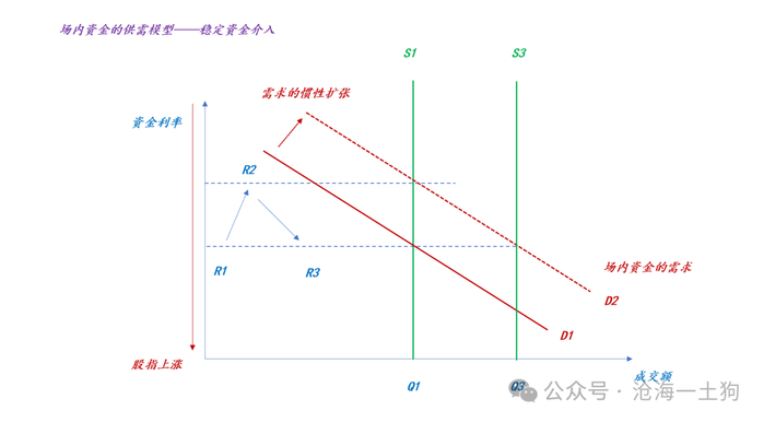 如上图所示,当稳定资金入场之后,场内资金的供给曲线从S1移动至S3,资金价格会从R2降低到R3,恶性循环的传导链条就被切断了。