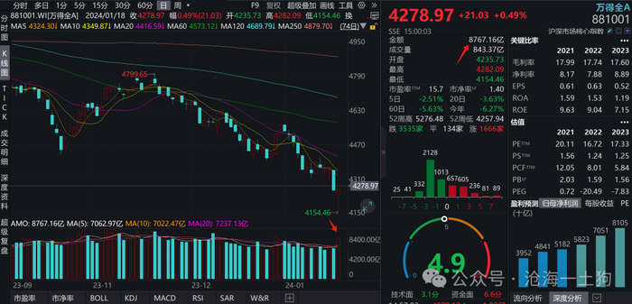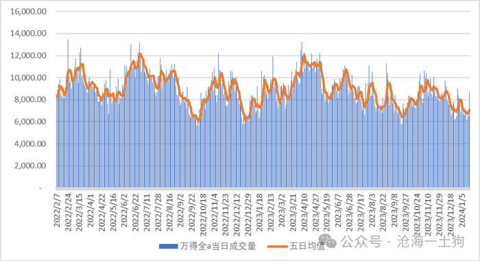 如上图所示,2024年1月17日,万得全a指数下跌2.40%,成交额只有6400亿出头。