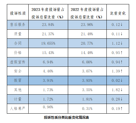 与上年相比,售后服务投诉仍居投诉总量首位,有关其他方面的投诉占比下降趋势最为明显,安全和价格的投诉占比上升幅度较大。