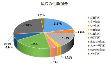 根据投诉性质分析(如图所示),售后服务4168件,占23.84%;质量3737件,占21.37%;合同3436件,占19.65%;价格2698件,占15.43%;虚假宣传1214件,占6.94%;安全780件,占4.46%;假冒683件,占3.91%;其他303件,占1.73%;计量300件,占1.72%;人格尊严167件,占0.96%;