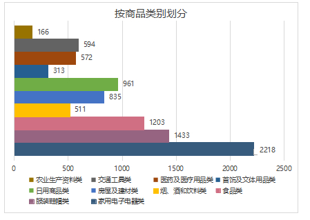 根据投诉商品分析,家用电子电器类2218件,占25.19%;服装鞋帽类1433件,占16.27%;食品类1203件,占13.66%;日用商品类961件,占10.91%;房屋及建材类835件,占9.48%;交通工具类594件,占6.75%;医药及医疗用品类572件,占6.5%;烟、酒和饮料类511件,占5.8%;首饰及文体用品类313件,占3.55%;农用生产资料类166件,占1.89%;