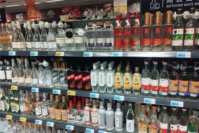 《华夏酒报》记者看到,该商超酒水区的光瓶酒涵盖了大江南北的全国名酒、区域知名品牌,从55度西凤老绿瓶、古井贡酒·怀旧版、玻汾,到顺品郎、绵柔尖庄、洋河大曲,再到双沟大曲、衡水老白干、宝丰大曲、徐府大曲、鸭溪窖、玉蝉、鹿邑大曲、凤城老窖、60度北大荒白酒、红星二锅头、牛栏山二锅头等,一应俱全。另外,42度玉泉酒(125ml)、50度绵柔尖庄(100ml)、45度小郎酒(100ml)等轻量光瓶酒,年轻人在大润发的小程序下单量较多。