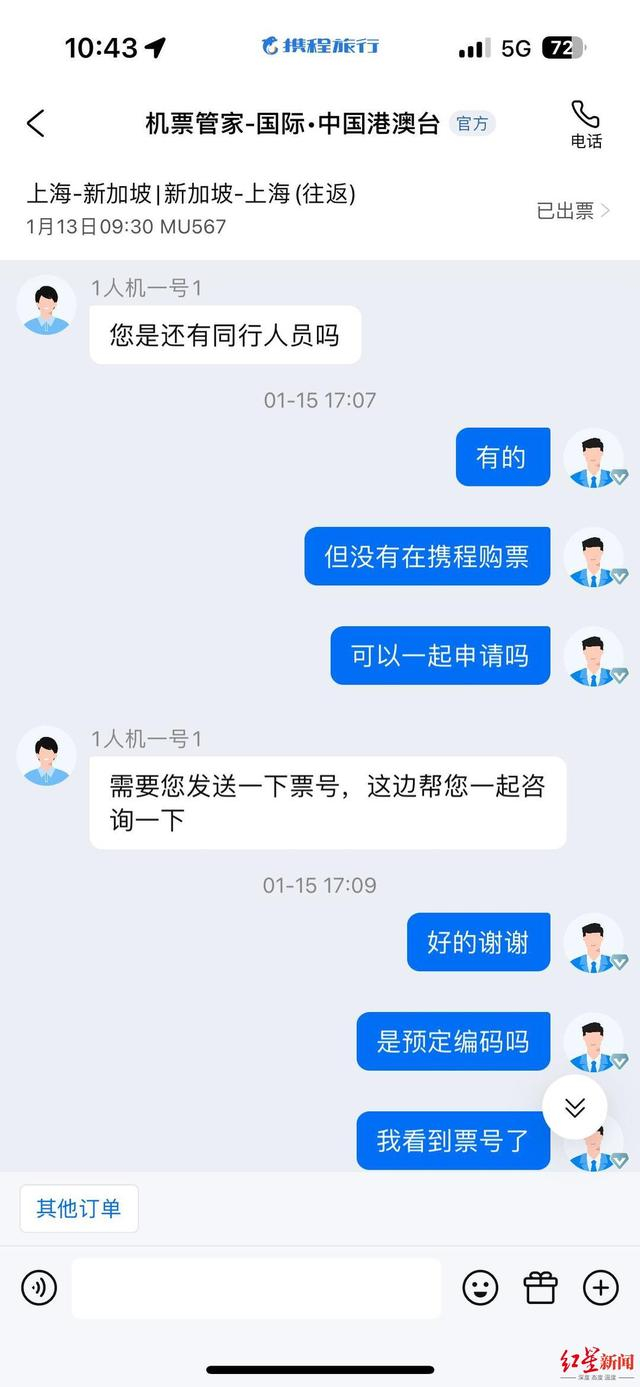 据了解,网友章女士一家三口1月13日乘坐东方航空MU567航班从上海飞往新加坡,原计划1月17日回程。但由于女儿生病,一家人决定提前回国。