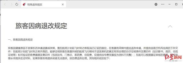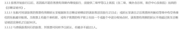 东航APP的公告讯息中,预订须知里《客票使用条件》对旅客因病退改规定描述为: