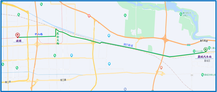 2. 运营路径:307国道、昆仑大街、中山路。