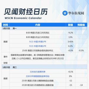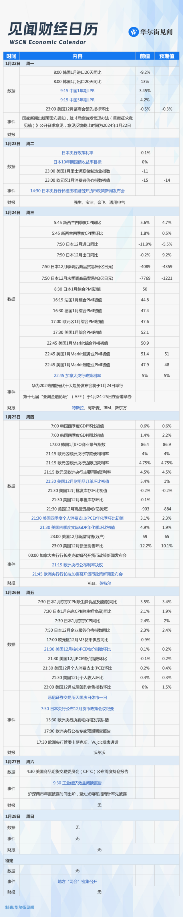 1月22日至1月26日当周重磅财经事件一览,以下均为北京时间: