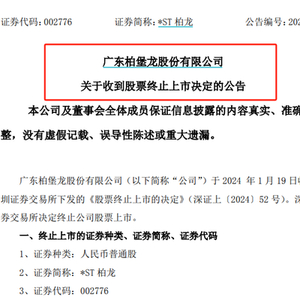 1月19日,*ST柏龙发布公告称,公司于当日收到深交所下发的《股票终止上市的决定》,深交所决定终止公司股票上市。