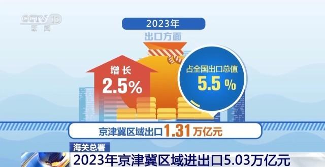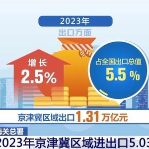 出口方面,2023年京津冀区域出口1.31万亿元,增长2.5%,占全国出口总值的5.5%。