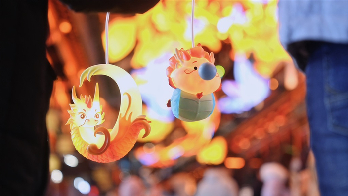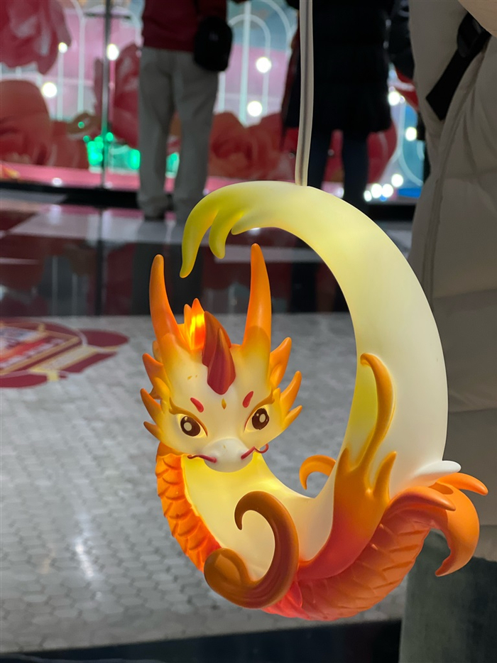 去年,豫园原创月神兔灯笼曾一灯难求,今年推出的两款手提国风龙灯,一经上架预售,速度火爆全网。金豫龙灯瑞瑞,以“汉玉龙”为造型,呈“C形”盘龙姿态,飞龙跃海;嘟嘟龙灯则是来自同款灯组,鱼龙三兄弟中的老二鱼龙嘟嘟,微胖的身材尽显福气,吹着泡泡,寓意“神龙吐珠”,传递喜气与平安。