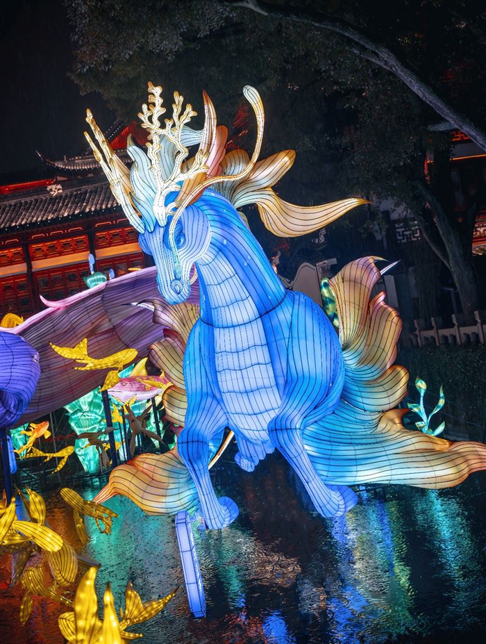 游园期间,市民游客还有机会邂逅鱼龙公主和龙马公子这对CP组合,他们由灯组变身真人NPC,营造沉浸式游园体验。人气灯组小胖嘟嘟和“山经篇”人气王“胐胐”也将成为NPC,随机空降快乐的园子。