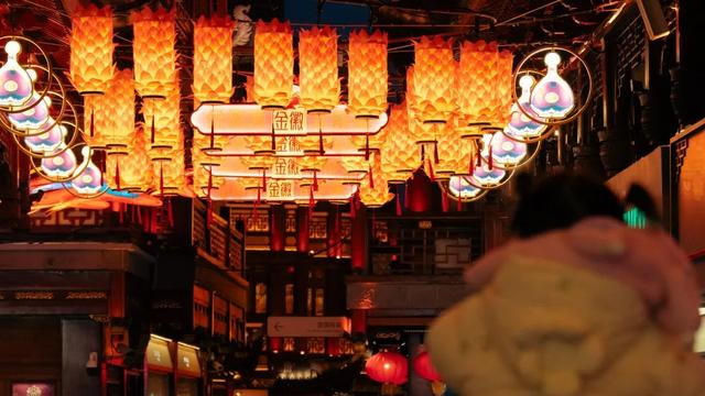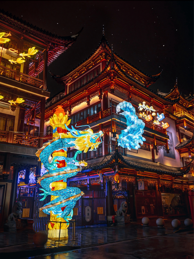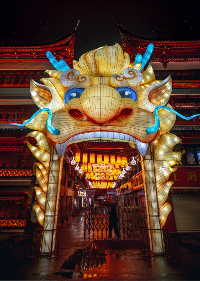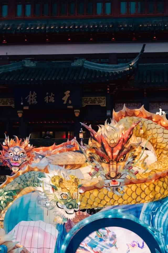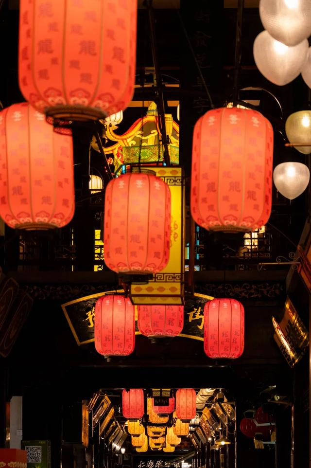 豫园老街被一盏盏龙纹宫灯妆点一新,用龙图腾串联起千年的龙文化和现代的审美,宫灯上装饰纹样取自苏州丝绸博物馆馆藏,时光流转间“寻龙逐梦”,历代龙纹逐光随影,渐次呈现。