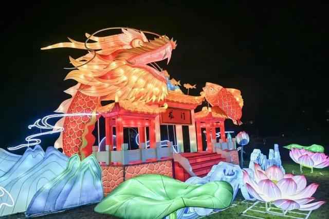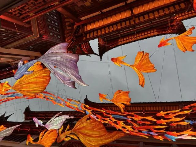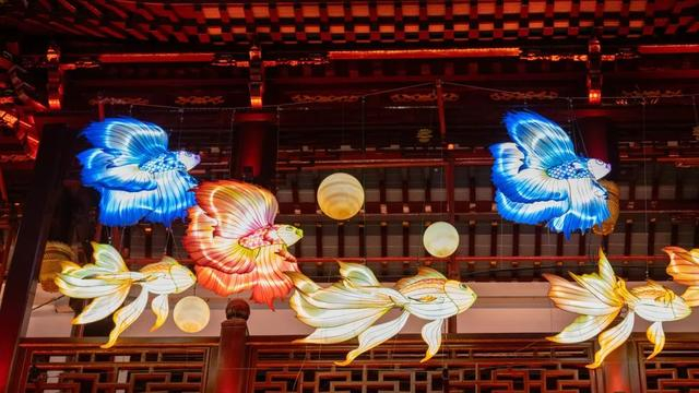 缤纷多彩的鱼群汇聚成游龙回旋之姿,游走在飞檐斗拱之间,将辛弃疾《青玉案·元夕》中所描绘的元夕灯会繁华之景,带到今时今日今宵,让人们身临其境地感受千年前的笔墨之美,人文情怀、浸润心灵。当亲友欢聚,同赏花灯,蓦然回首之时,亦能寻得佳人所在。