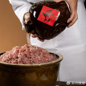 何发坤在制作腊肠原料时将白酒倒入肉粒中(广东珠江桥供图)