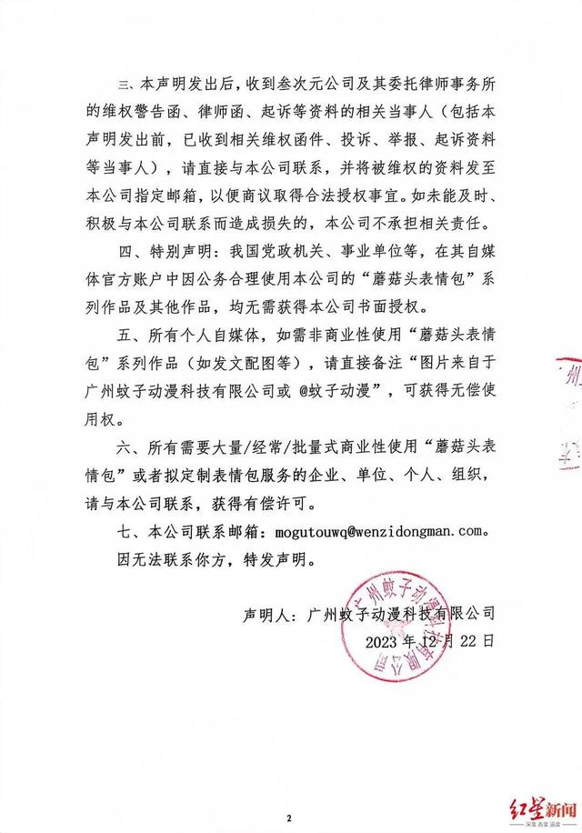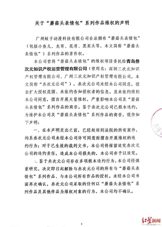 2023年12月22日,蚊子动漫公司正式在微博等官方社交平台上公示解约函,并刊登解除授权代理的声明,讲明维权风波始末,提醒被维权者。声明称,叁次元公司未经公司同意,擅自扩大授权范围,未依约告知侵权者的信息,擅自开展大量维权,严重影响公司和“蘑菇头表情包”系列作品的商誉,决定从2023年12月22日起解除与叁次元公司的所有授权合作。