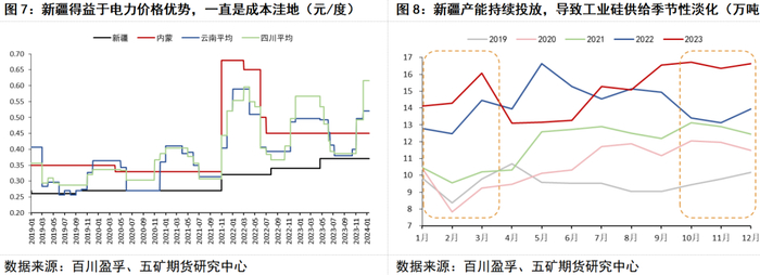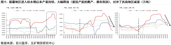 2023年四季度,新疆地区产量持续、大幅释放(新投产能的爬产、拥有利润),对冲了西南地区减量(西南地区产量的实际降幅及速率均高于预期),使得工业硅在枯水期的供给收缩显著低于市场预期,甚至在枯水期前期呈现出供给继续小幅增长的情况,我们认为这是四季度市场所预期的上涨行情没有到来的主要原因。