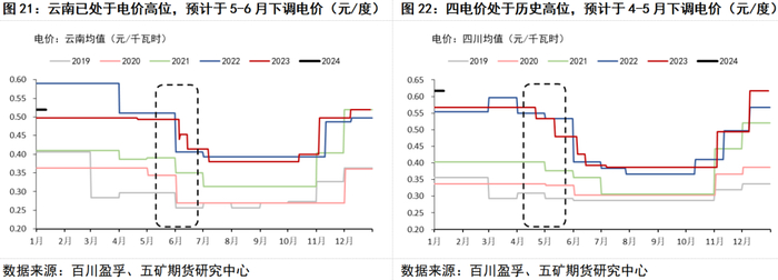 枯水期西南地区电价已上调至高位,尤其四川地区已至历史新高,预计继续上调概率极低,将维持至枯水期结束(四川4月份、云南5月份)。这意味着西南地区成本的抬升已至终点,向上空间十分有限。