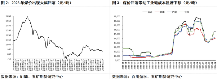 对于2023年工业硅价格的走弱,我们认为最主要的原因在于成本端的显著下移以及历史遗留高库存提供的现货资源宽松的土壤。一方面,2023年煤炭价格大幅走弱,以北方港口5500K动力煤价格为标的,价格从2022年10月份高点1640元/吨回落至当前915元(截至发稿日),降幅达45%,而煤价的大幅走弱带动了工业硅成本出现显著下移;另一方面,虽然从年度整体的供求结构来看,2023年宽松程度相较于2022年出现明显改善,仅处于略微宽松的格局,但2022年的大幅宽松所遗留的大量库存造就了现货宽松的土壤(2022年的过剩量仅部分体现在统计的显性库存中),对现货价格造成了明显的压制。