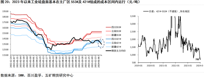 同时,我们可以看出,受限于整体供求格局的宽松情况(更多是高库存带来的影响),2023年以来工业硅盘面基本在主厂区553#及421#组成的成本区间内运行,且当前盘面价格已显著低于西南地区421#盘面成本,价格已属于明显的低估范畴。