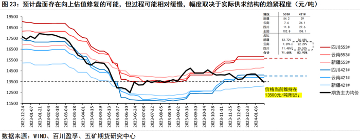 从当前新疆、云南、四川几个主产区的成本情况来看:553#折盘面价格区间在(14750,15600)区间,其中新疆为低价区;421#折盘面价格区间在(13050,14110)区间,其中云南及四川成本中枢维持在14000元/吨附近。
