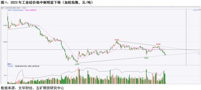 回顾2023年,我们看到工业硅价格中枢明显下移,从18000元/吨附近回落至13500元/吨附近(加权指数),整体跌幅超过20%。